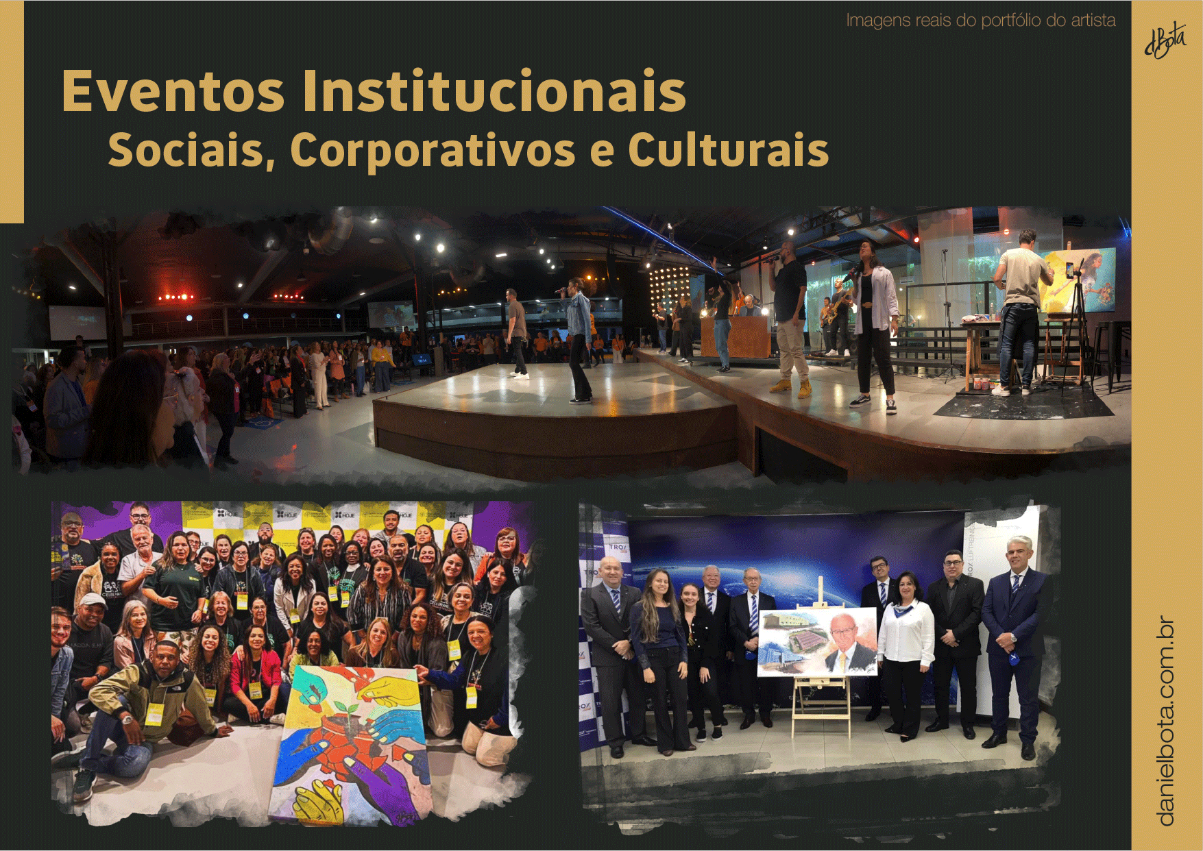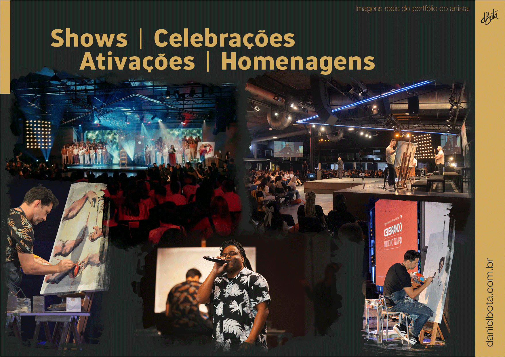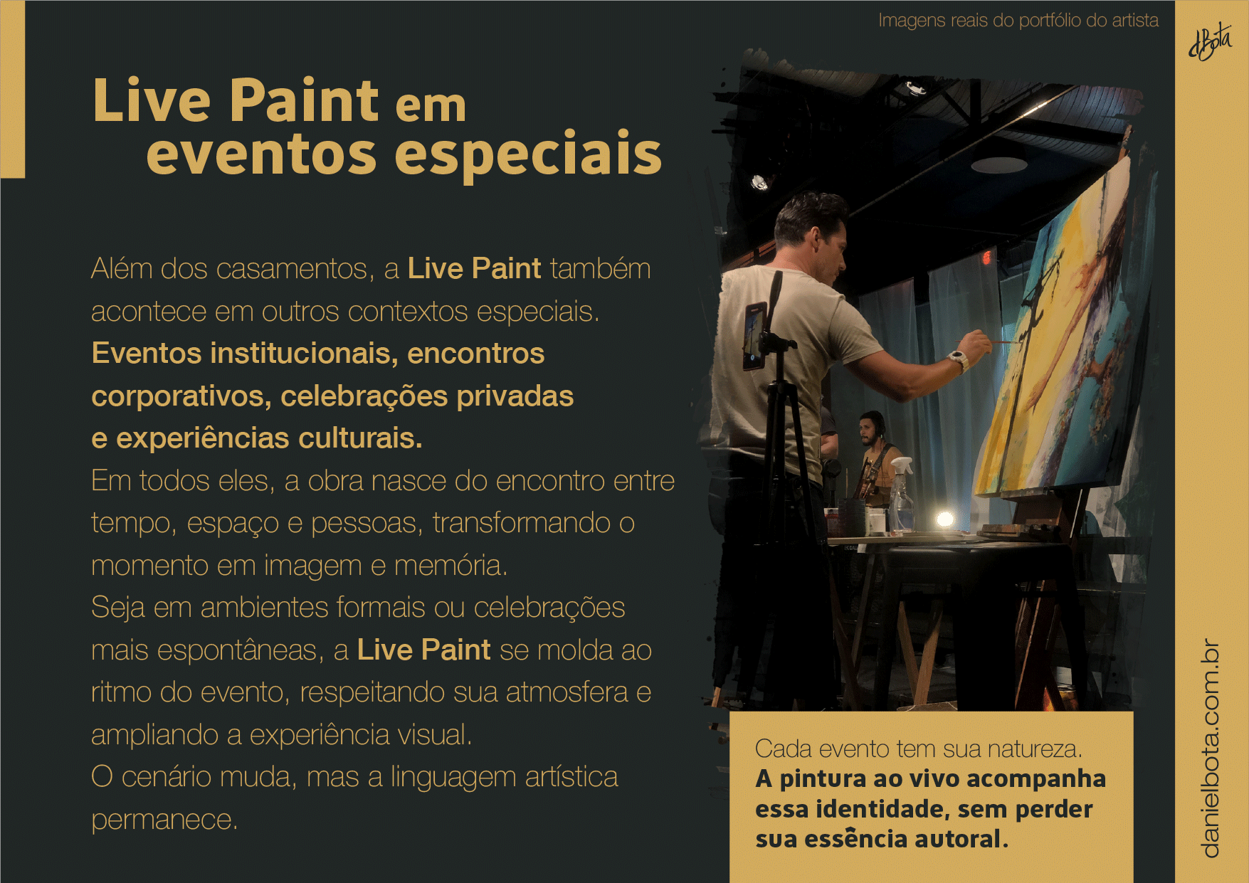 Um dos diferenciais da minha arte em todos esses anos tem sido as pinturas ao vivo (Live Paint) em eventos especiais como: cerimônias de casamento, eventos institucionais, corporativos, bem como, eventos culturais, shows, celebrações, ativações, homenagens, palestras, convenções, congressos e feiras.